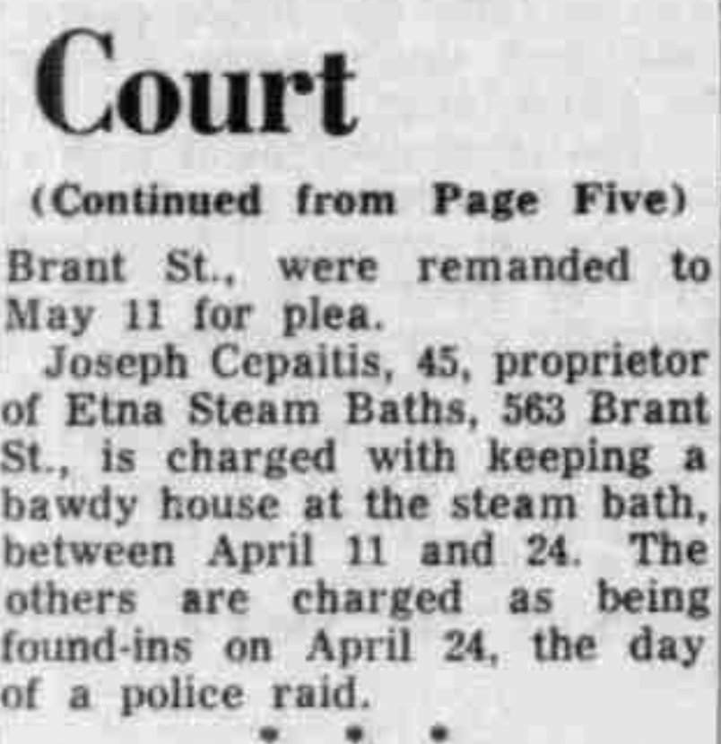 Seven American men and two Windsor people were charged in connection to an alleged bawdy house at 563 Brant Street. Joseph Cepaitis, the owner of the Etna Steam Baths was charged with keeping a bawdy house at that address.