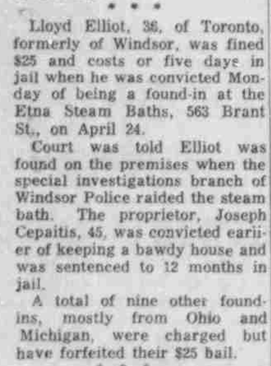 Lloyd Elliot of Toronto, and formerly of Windsor, was fined 25 dollars and costs of five days in jail when convicted on Monday of being found in the Etna Steam Baths on April 24. Most of the other individuals were from Ohio or Michigan.