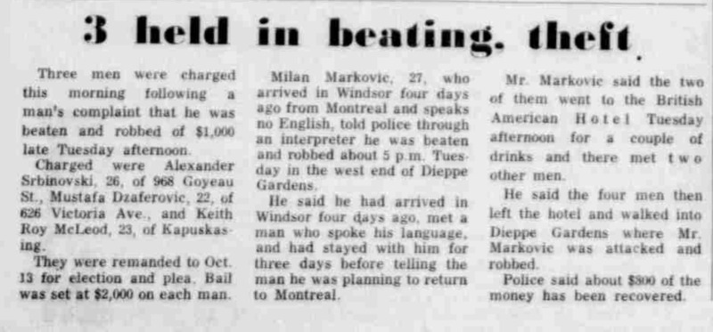 Alexander Srbinovski, Mustafa Dzaferovic, and Roy McLeod beat up Milan Markovic and robbed him of 1000 dollars late Tuesday afternoon. He had known one of them for a few days, and they went to the British American Hotel together and met two other men, went to the Dieppe Gardens, and this is where he was beaten.
