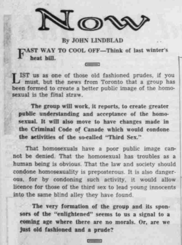 The author informs readers that a group in Toronto has been formed to "create a better public image of the homosexual" and expresses his frustration with this. He says the coming age may have no morals.