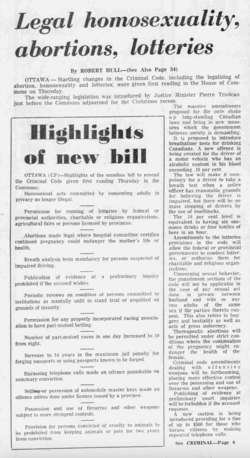 Justice Minister Pierre Trudeau introduced legislation to legalize abortion, homosexuality, and lotteries. New laws are also being proposed to introduce breathalyzers and to charge motorists with a BAC level of 0.1 or higher.