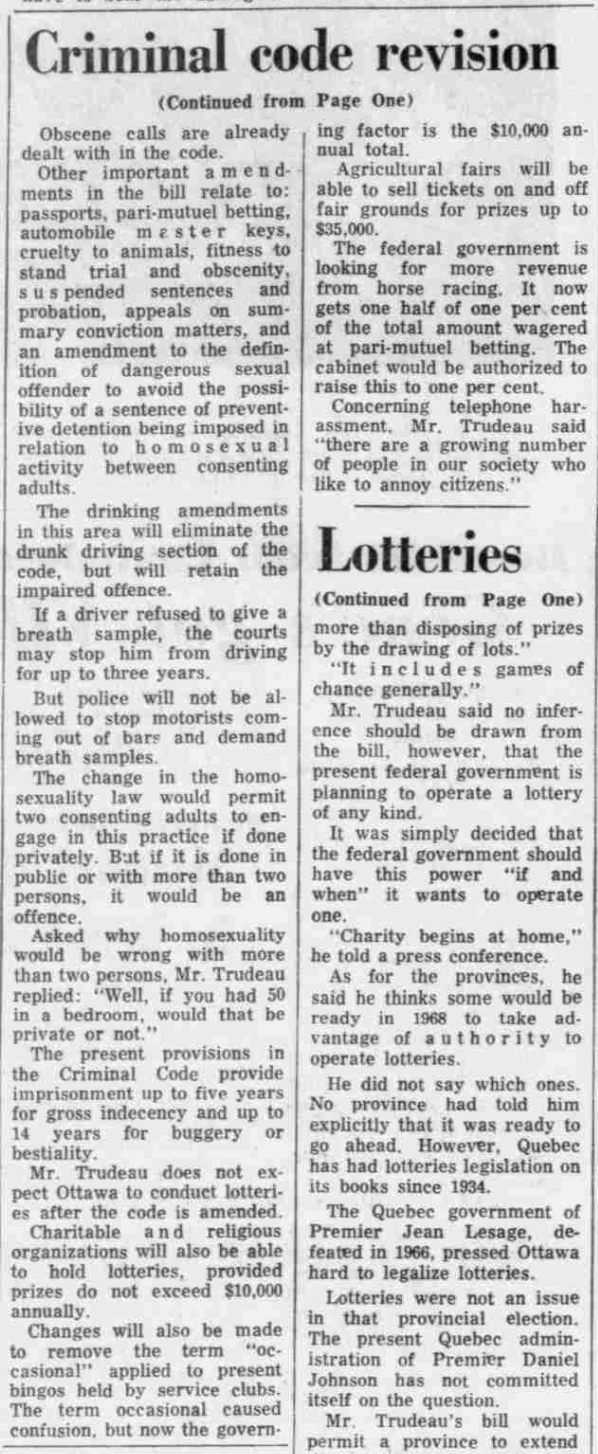 Justice Minister Pierre Trudeau introduced to legalize abortion, homosexuality, and lotteries. New laws are also being proposed to introduce breathalyzers and to charge motorists with a BAC level of 0.1 or higher.