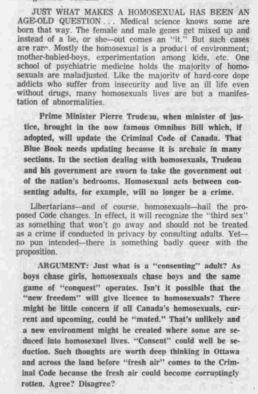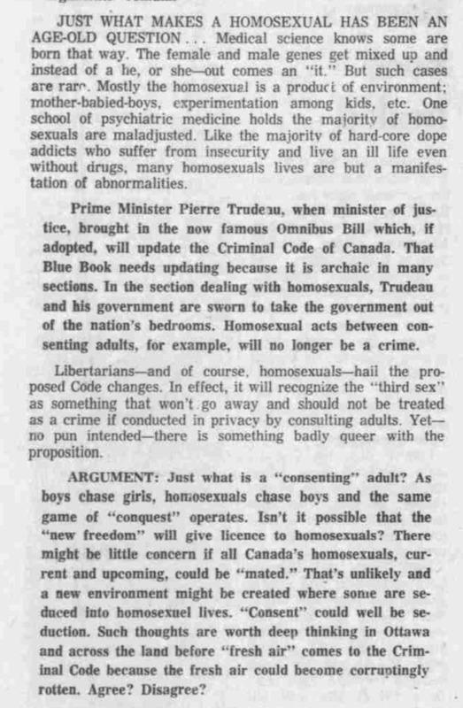 Lindblad writes about his fear that the Criminal Code changes will lead straight people to be seduced into a life of homosexuality.