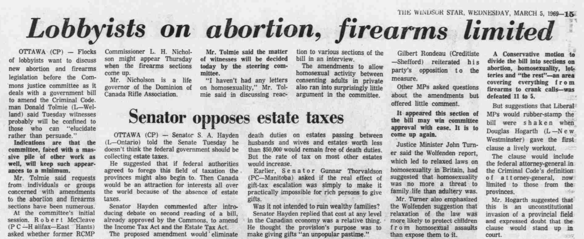 The Commons justice committee has received many letters protesting the abortion and firearm rulings. Mr. Donald Tolmie said that "I haven't had any letters on homosexuality" and the author writes that this topic has "ran into surprisingly little argument in the committee".