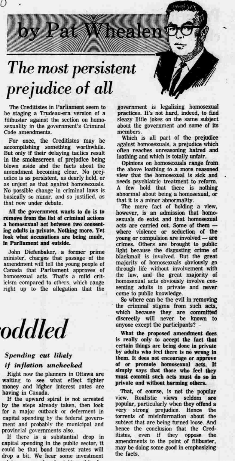 Pat Whealen gives his opinion on the proposed Criminal Code changes. He describes the changes as minor and justified. He says there is a wide belief about the morals of homosexuality, but it is real and homosexual acts do occur. He thinks when these acts are with a child or when coercion is involved, it is a crime, but says that most of these acts are done between two consenting adults.