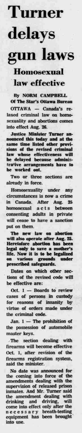 The new criminal law on homosexuality comes into effect August 26. Abortions will also be legalized on various grounds on this date. Other sections of the code will become effective at later dates.