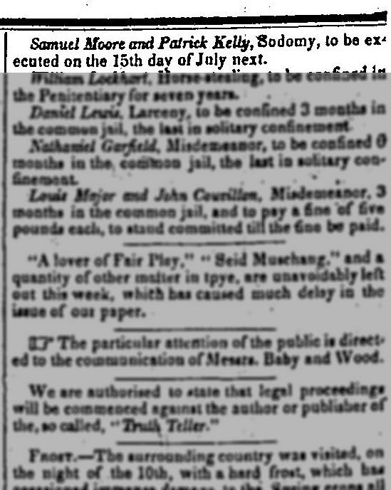 In 1842, two soldiers stationed at Fort Malden, Amherstburg, Ontario, Samuel Moore (Service number 786) and Patrick Kelly (Service number 463), were the first two Canadian men who were convicted of engaging in sodomy. At the time, it was reported in the June 16, 1842, edition of the Western Herald, a prominent newspaper in the Windsor-Essex region at the time. Initially, both men pleaded not guilty, but were sentenced to death. However, both had their sentence commuted to life in prison.