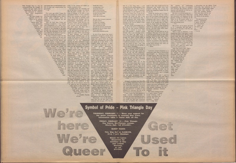 The Pink Triangle originated as a symbol in Nazi Germany, used to identify LGBT+ individuals during WWII. Over time, the queer community reclaimed this symbol as their own, as a show of resilience and inclusion in the face of discrimination. Pink Triangle Day was started by the Canadian Lesbian & Gay Rights Coalition and is held annually on February 14th to remember and celebrate the queer community. The first Pink Triangle day at the University of Windsor was held in 1993, and was featured in the February 8, 1993 edition of The Lance, the student newspaper.